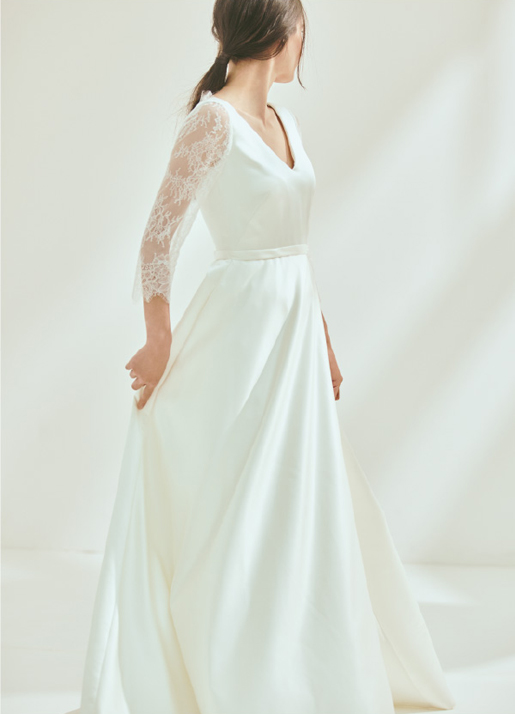 クラシカルに、素材にはケミカルレースを使ってデザイン性の高い一着に。さらにマットな質感が個性的な印象を与えます。