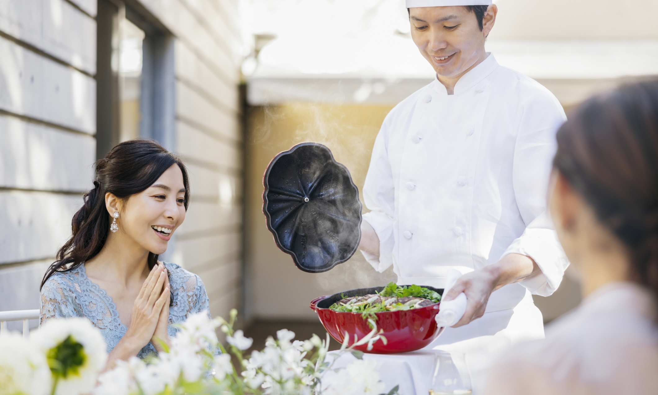 パーティー会場にはプライベートキッチンを併設。リゾナーレ八ヶ岳のメインダイニング「OTTO SETTE」のシェフが目の前でお料理を仕上げます。香りや音に包まれながら、料理を囲むひとときには自然と会話が生まれ、ご家族だけのお集まりでも安心してお楽しみいただけます。