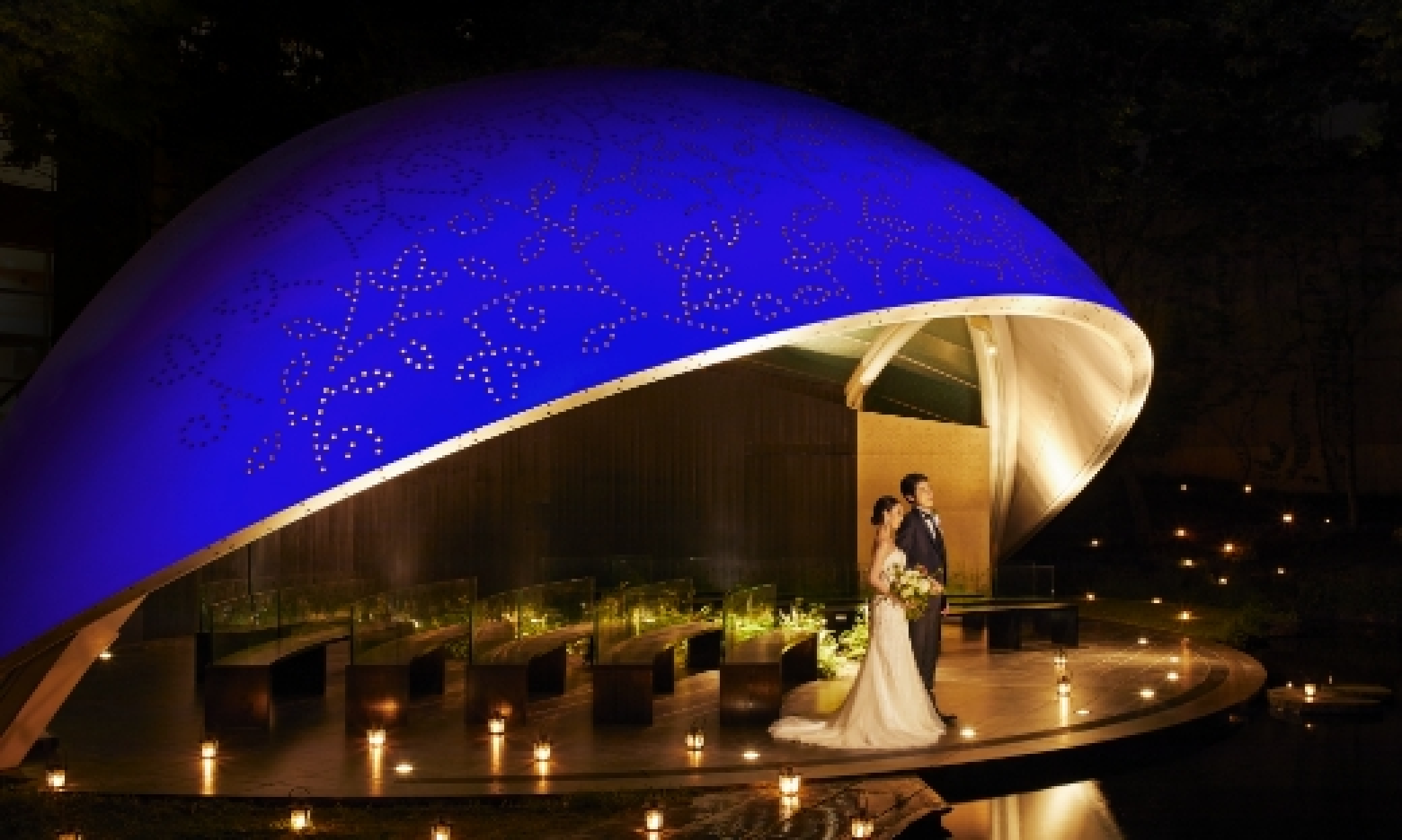 夜はライトアップされたチャペルと無数のキャンドルが幻想的な雰囲気に。 自然と調和したデザインチャペルで紡ぐ幸せの時間は、より思い出深く特別なウエディングを演出します。