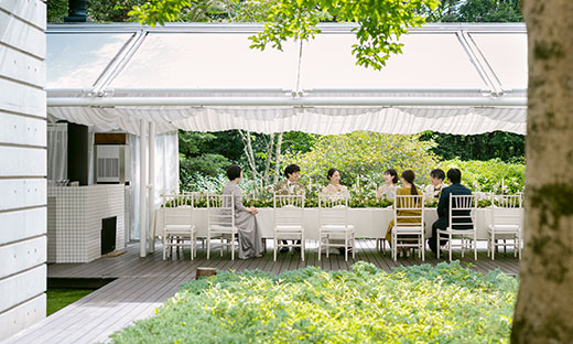 スタイリッシュなリビング・ダイニングとガーデンが調和した、温かみあるアットホームな空間「アルフレスコ」。そして、両面をガラスに囲まれ、四季の自然を感じながら上質な時間を過ごせる「ブリラーレ」。それぞれ異なる魅力を持つ、一棟貸切の2つの会場から、おふたりのスタイルに合わせてお選びいただけます。どちらもゲストルームが併設され、翌朝までゆったりと過ごせるステイウエディングを叶えます。